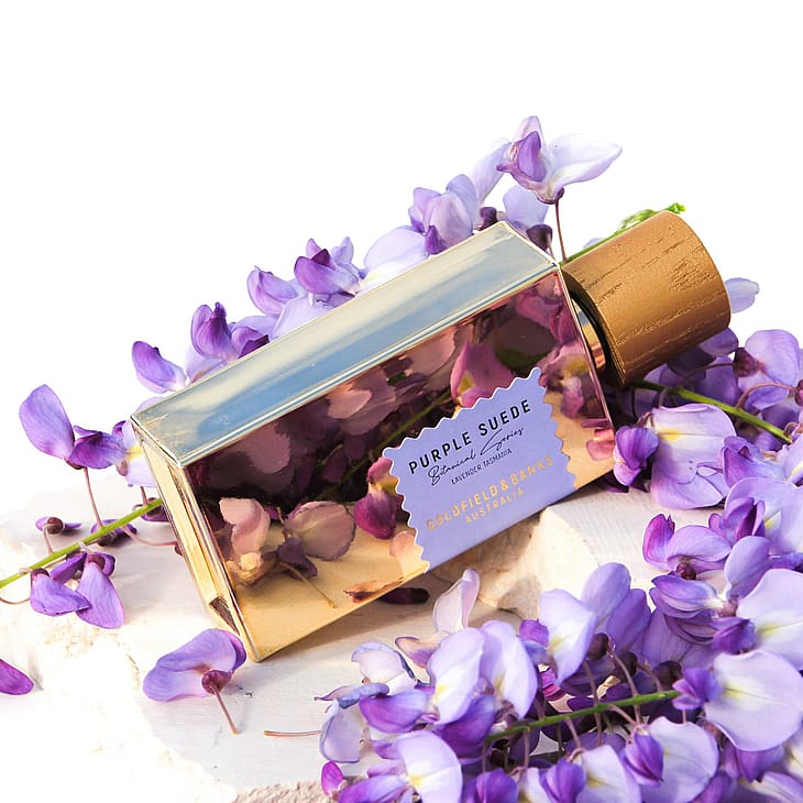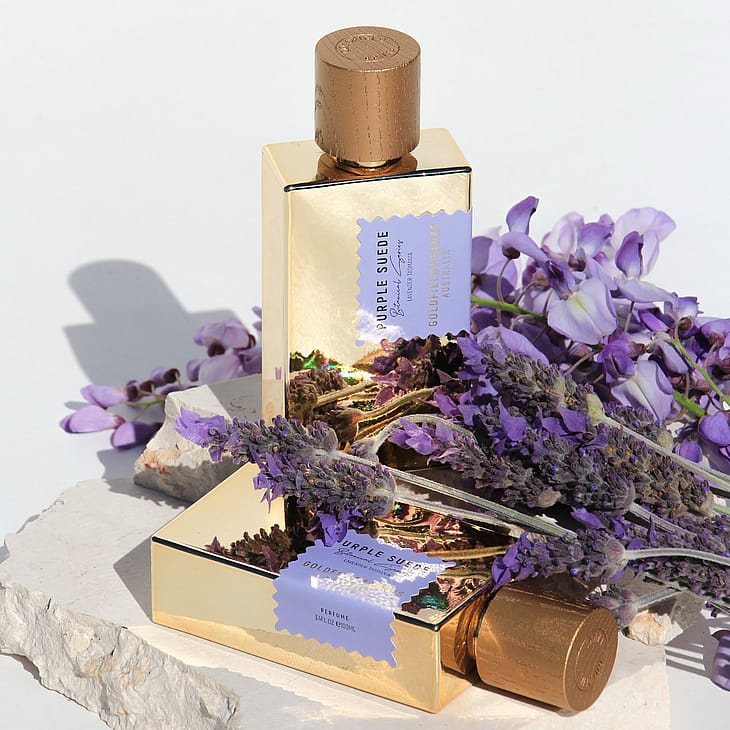Purple Suede er en olfaktorisk fantasi, der udtrykker duften af aromatiske marker med solbeskinnet lavendel, hvor blomsterne er sprøde af solens voldsomme varme. Kombineret med duften af gyldenbrune sadler afslører denne sensuelle parfume en karakteristisk rig og tør sillage. En læderagtig aromatisk parfume af lavendel, pink peber, isopblomster, civet, røget træ og mørk amber, der indkapsler den tørre varme i australske somre blandt lilla marker. En moderne og uventet fortolkning af lavendel og læder.
