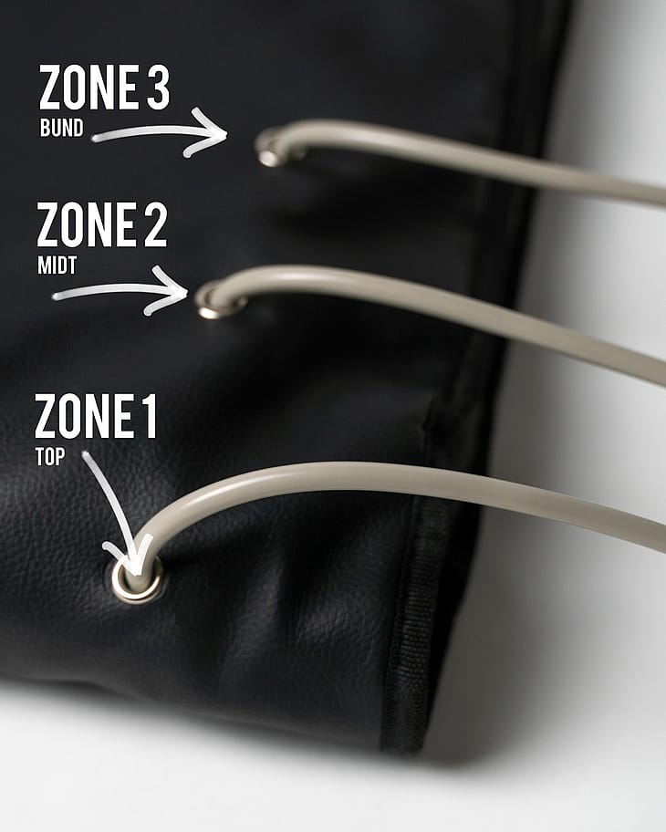 Model Luksus fra GoodFlow er inddelt i 3 zoner. Zone 1 er overkrop området, zone 2 er midt-krop området, og zone 3 er underben/fod område.