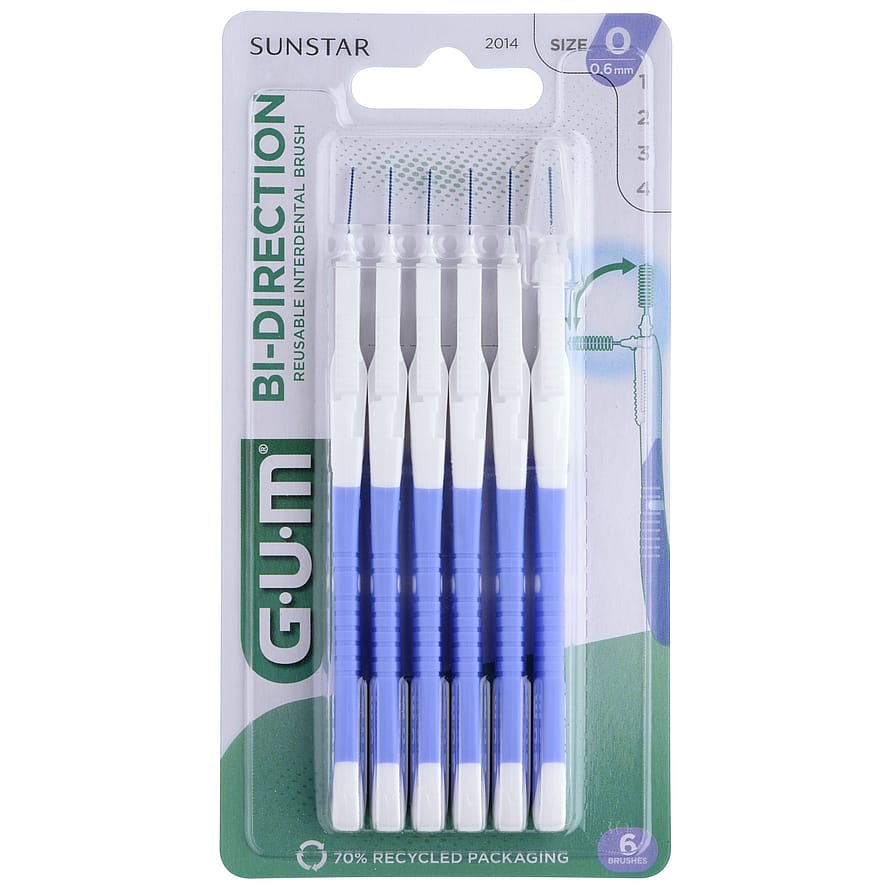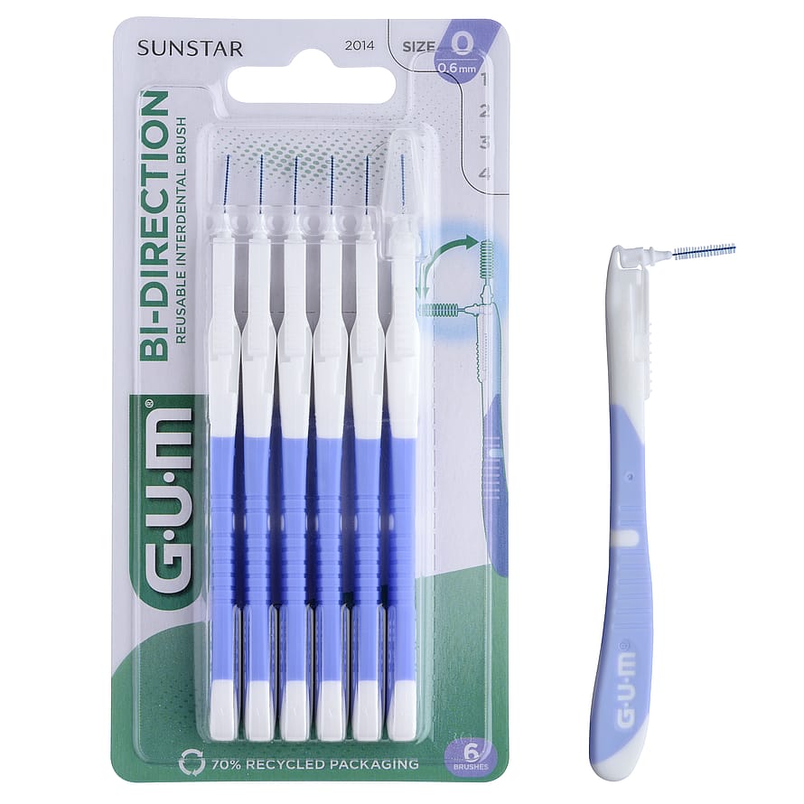 GUM Bi-Direction mellemrumsbørster er designet med et dobbeltvinklet hoved, som kan vinkles i to retninger. Derved når mellemrumsbørsten let alle tænder og hjælper med at rense de steder, hvor tandbørsten ikke kommer - især længst tilbage i munden og i tandmellemrummene, hvor plak og madrester kan samle sig. De er også velegnet hvis du har en bro, implantater, tilbagetrukket tandkød eller et tandreguleringsapparatur.
