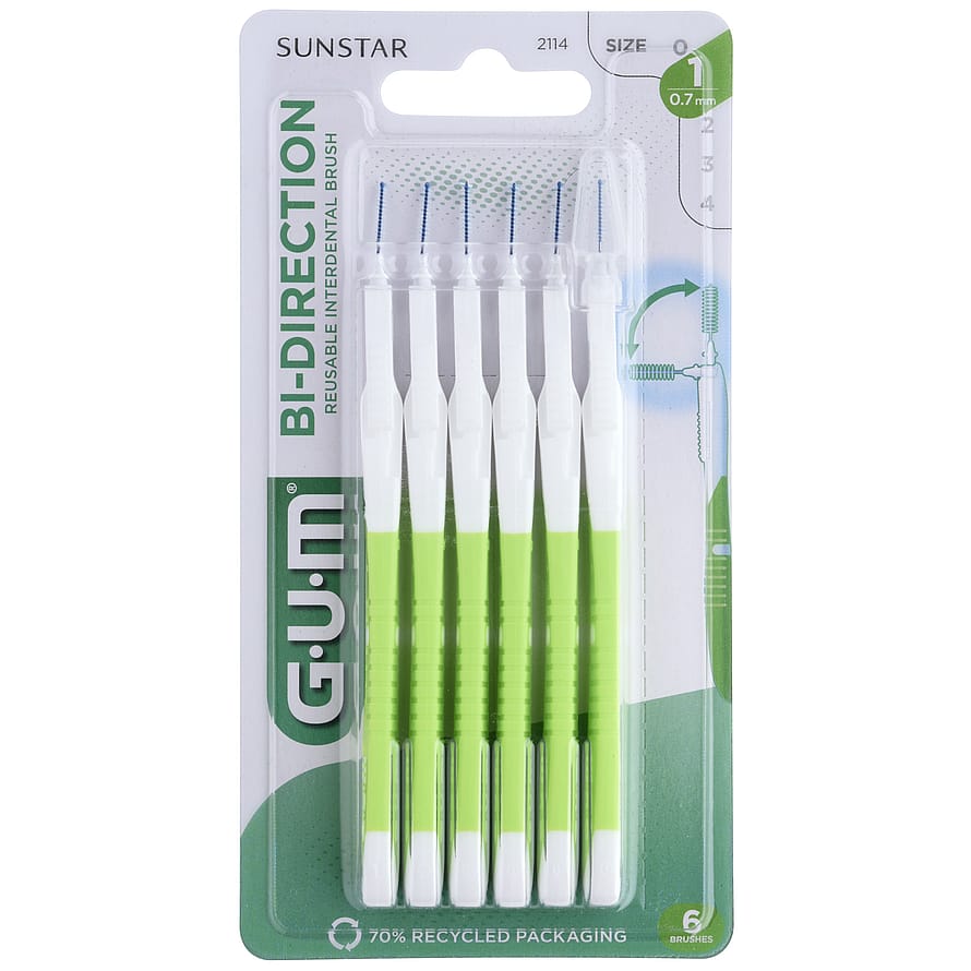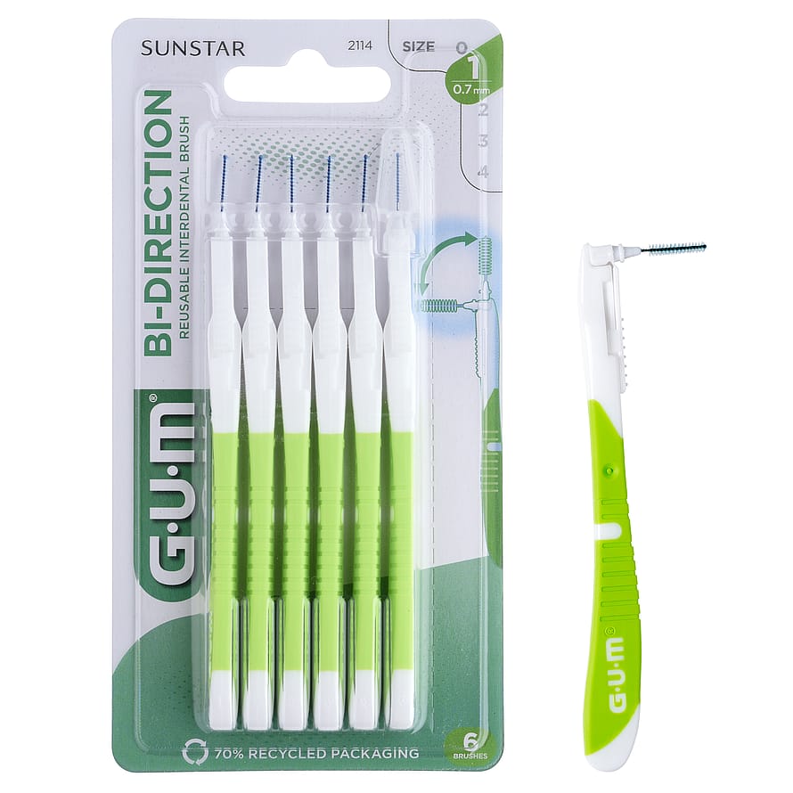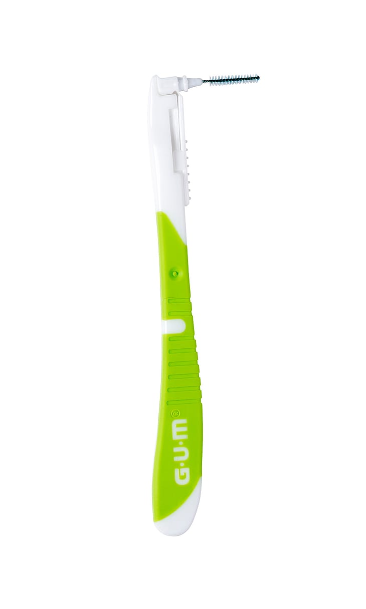 GUM Bi-Direction mellemrumsbørster er designet med et dobbeltvinklet hoved, som kan vinkles i to retninger. Derved når mellemrumsbørsten let alle tænder og hjælper med at rense de steder, hvor tandbørsten ikke kommer - især længst tilbage i munden og i tandmellemrummene, hvor plak og madrester kan samle sig. De er også velegnet hvis du har en bro, implantater, tilbagetrukket tandkød eller et tandreguleringsapparatur.