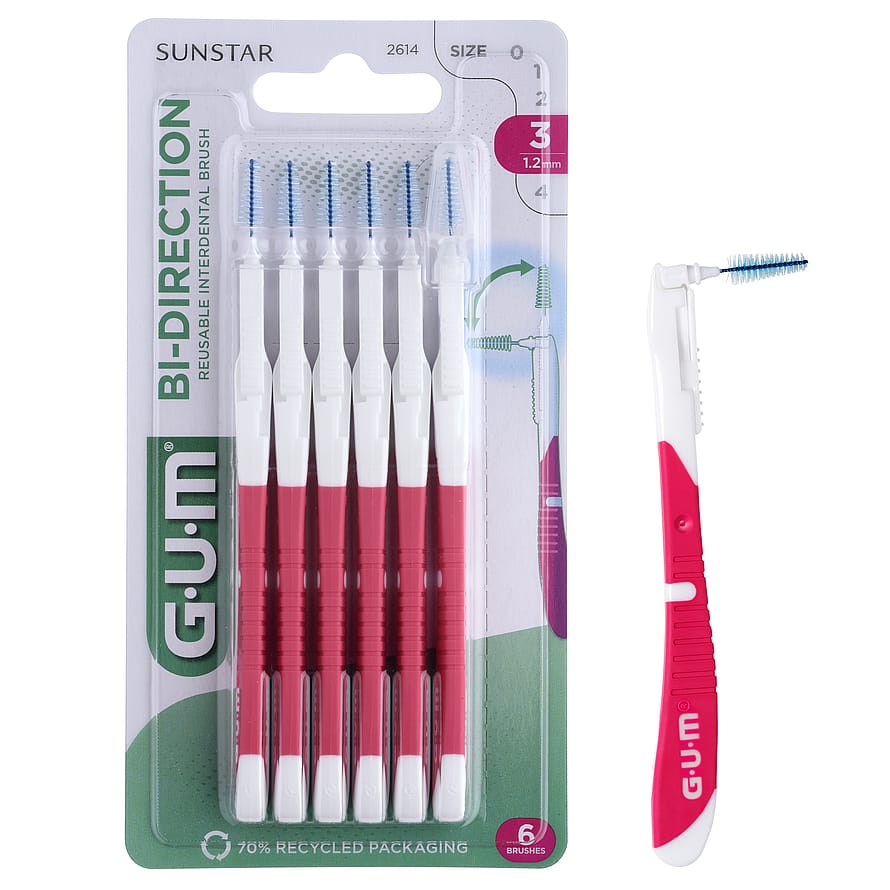 GUM Bi-Direction mellemrumsbørster er designet med et dobbeltvinklet hoved, som kan vinkles i to retninger. Derved når mellemrumsbørsten let alle tænder og hjælper med at rense de steder, hvor tandbørsten ikke kommer - især længst tilbage i munden og i tandmellemrummene, hvor plak og madrester kan samle sig. De er også velegnet hvis du har en bro, implantater, tilbagetrukket tandkød eller et tandreguleringsapparatur.
