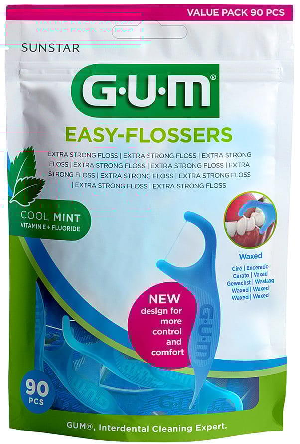 GUM Easy Flosser fjerner madrester og plak mellem tænderne. Tandtråden er ekstra stærk og med fluor- og vitamin E beklægning. Ergonomisk greb.