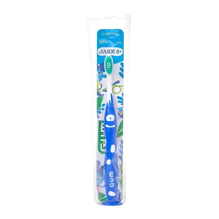 GUM Junior tandbørste er udviklet til børn fra 6+. Tandbørsten har et polstret børstehoved med bløde børster, et ergonomisk godt greb til barnehænder samt en sugekop, så tandbørsten kan stå selv ved siden af håndvasken.