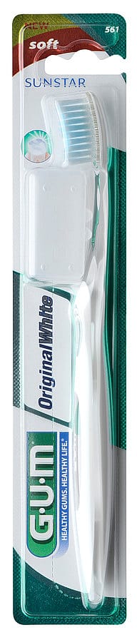 GUM Original White tandbørste er en soft voksen tandbørste med et lille børstehoved og særlige strå med gummidupper, som polerer tænderne hvidere.