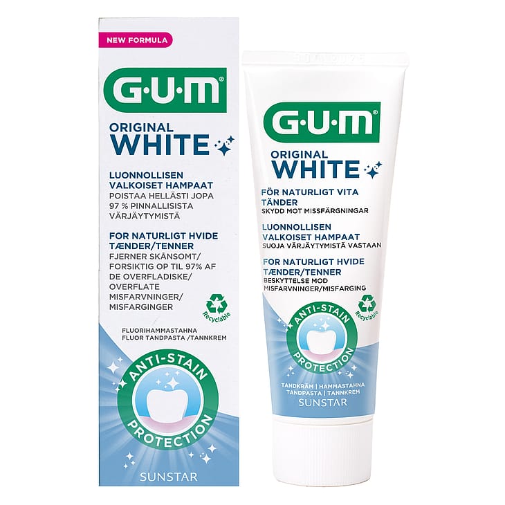 Fluorid-tandpasta for naturligt hvidere tænder, som også beskytter mod misfarvninger.