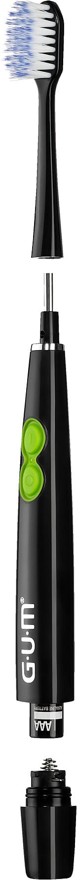 GUM Sonic batteri tandbørste i sort incl. AAA batteri. Tandbørsten fjerner 47 gange mere plak end en almindelig tandbørste. Videnskabeligt bevist. Når 50% længere ind mellem tænder og tandkødsranden takket være 12000 soniske vibrationer i minuttet. Meget effektiv manuel tandbørste takket være den soniske effekt.
