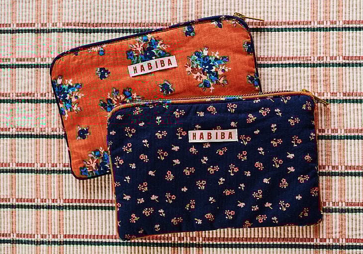 Den har en indvendig lynlåslomme og fine piping detaljer. Det røde print med blomsterbuketter er smukt sammen med pipings i det lille blå blomsterprint.