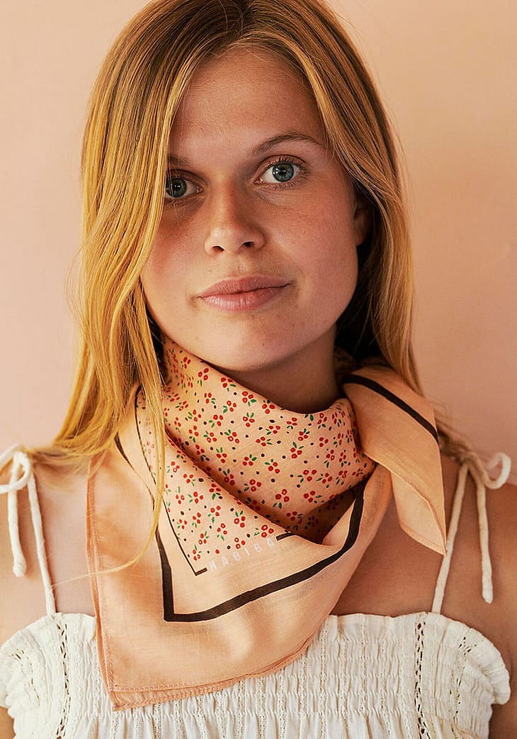 Denne bandana har et lille fint håndtegnet print med blomster og sløjfer samt en kontrastkant og et lille håndtegnet logo.