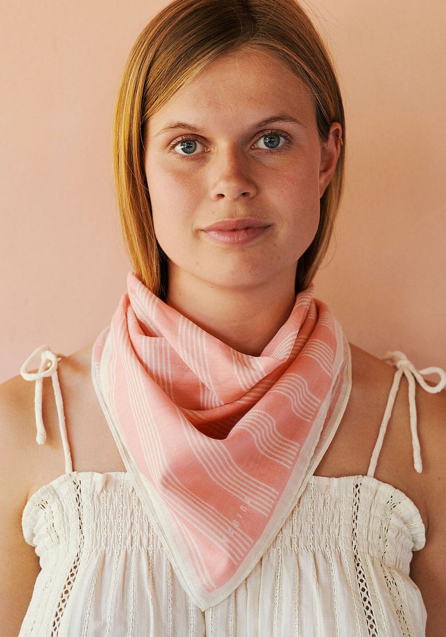 Denne bandana har et lille fint håndtegnet print med blomster og sløjfer samt en kontrastkant og et lille håndtegnet logo.