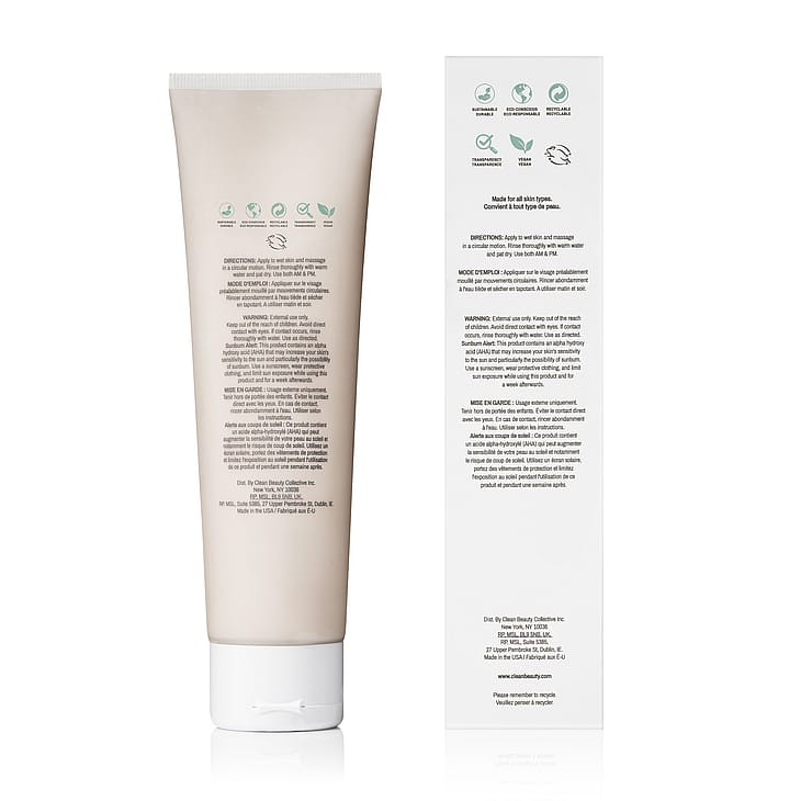 Eksfolierende AHA- og BHA-syrer hjælper med at fjerne døde hudceller for en mere strålende hud. pH-balancerende aminosyrer renser skånsomt uden at fjerne hudens naturlige olier, mens lilla ler hjælper til med at detoxe huden samt fjerne snavs og overskydende olie.