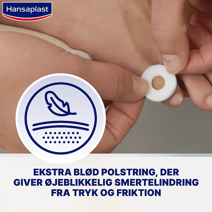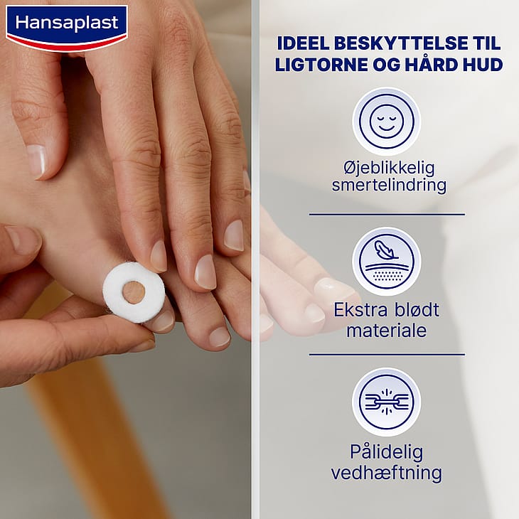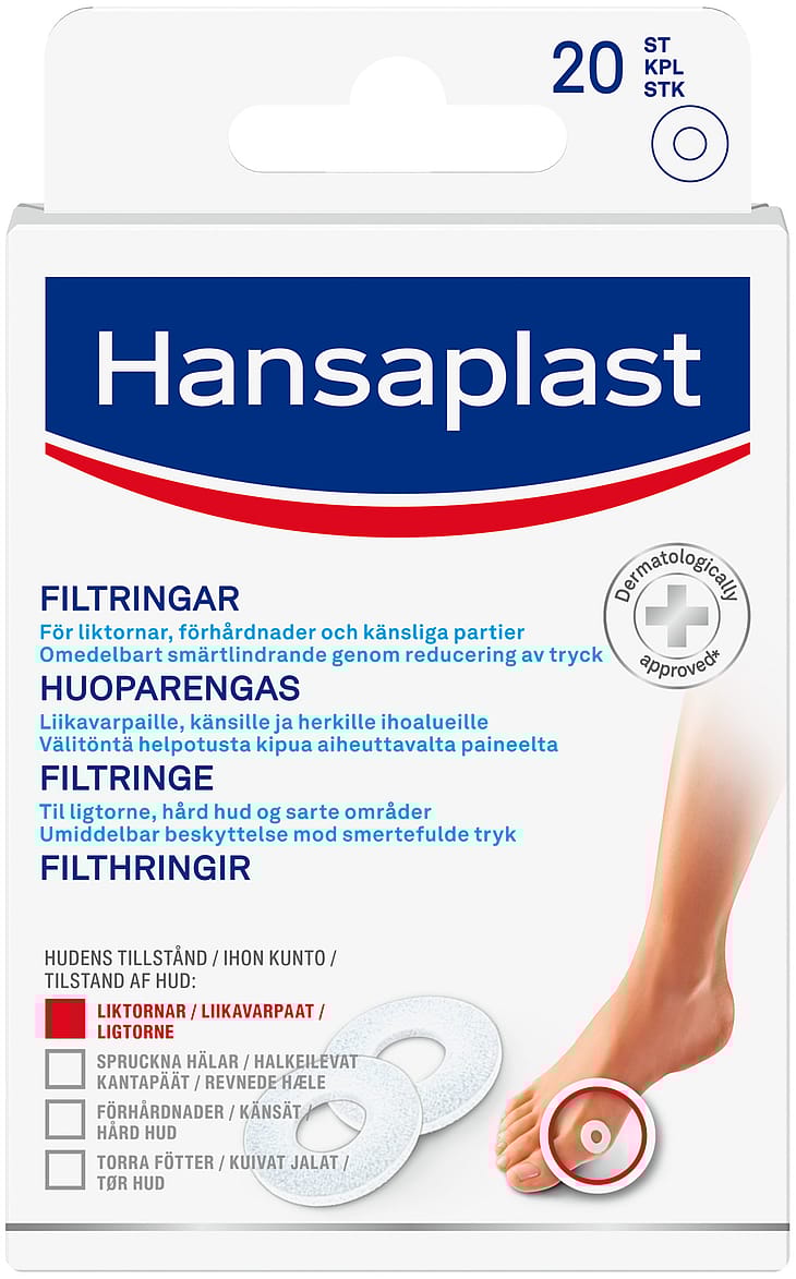 Hansaplast Filtringer er selvklæbende filtringe, der giver optimal beskyttelse af ligtorne, hård hud og følsomme områder, især på og mellem tæerne.