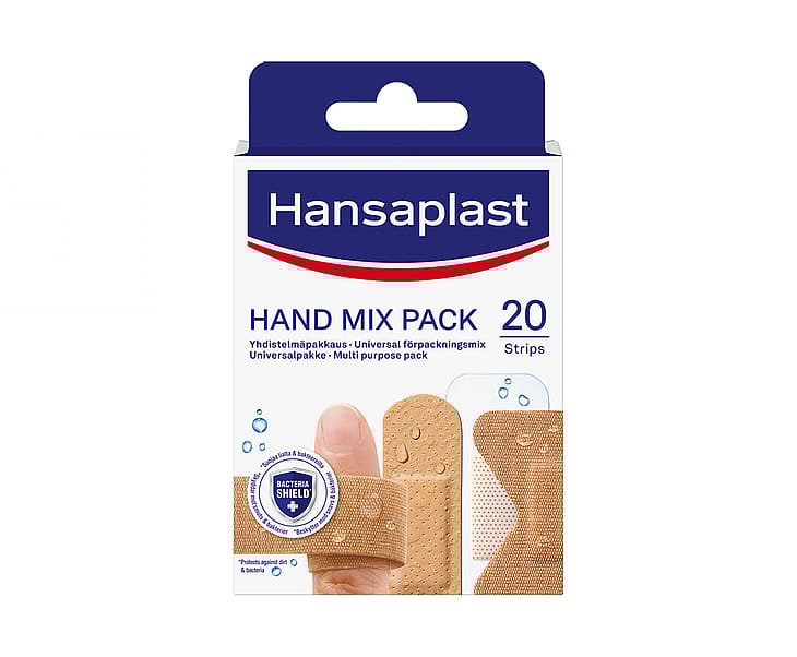 Hansaplast hånd blandet pakke indeholder et udvalg af plastre i forskellige former og materialer til forskellige formål.