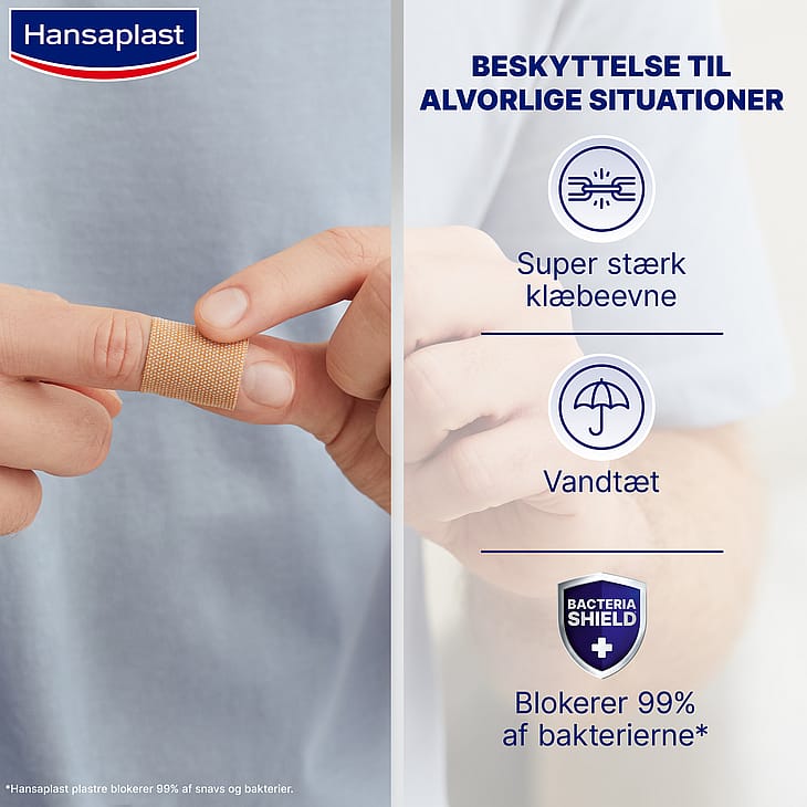 Hansaplast Bacteria Shield plaster skaber en beskyttende barriere, som forhindrer 99 % af bakterierne i at komme i kontakt med såret.