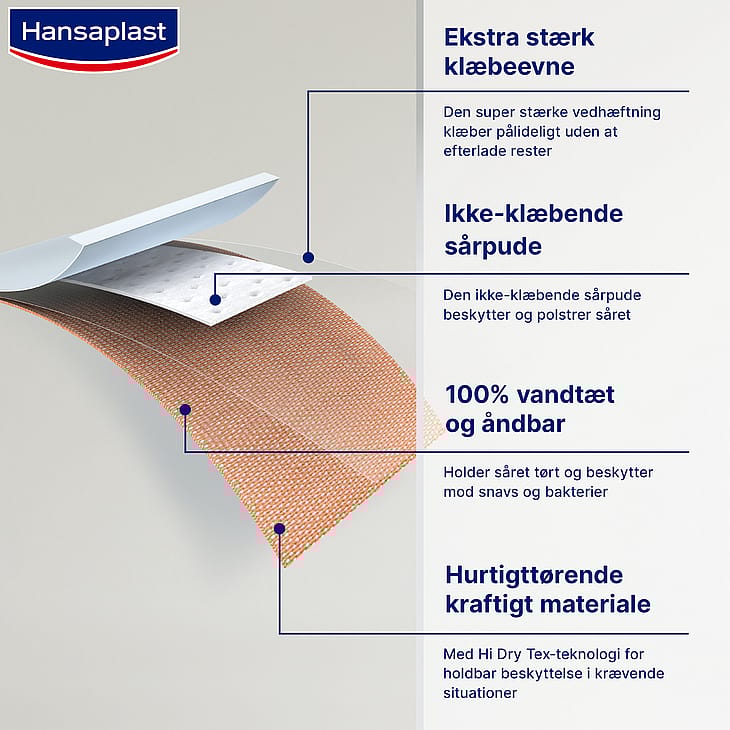 Dette plaster er det eneste ekstra kraftige, åndbare og vandtætte stofplaster, som giver såret optimal beskyttelse, selv under de vanskeligste forhold.