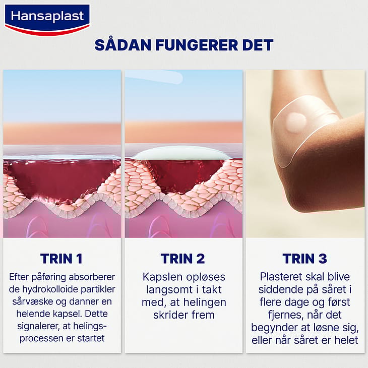 Hydrokolloidplaster, hele plasterets overflade fungerer som sårpude. Plasteret bruger hydrokolloid-teknologi, der danner en helende kapsel over såret. Den helende kapsel opretholder optimale fugtniveauer i sårområdet og fremmer derfor sårhelingsprocessen. Takket være bevarelsen af fugt i sårområdet reduceres risikoen for ardannelse.