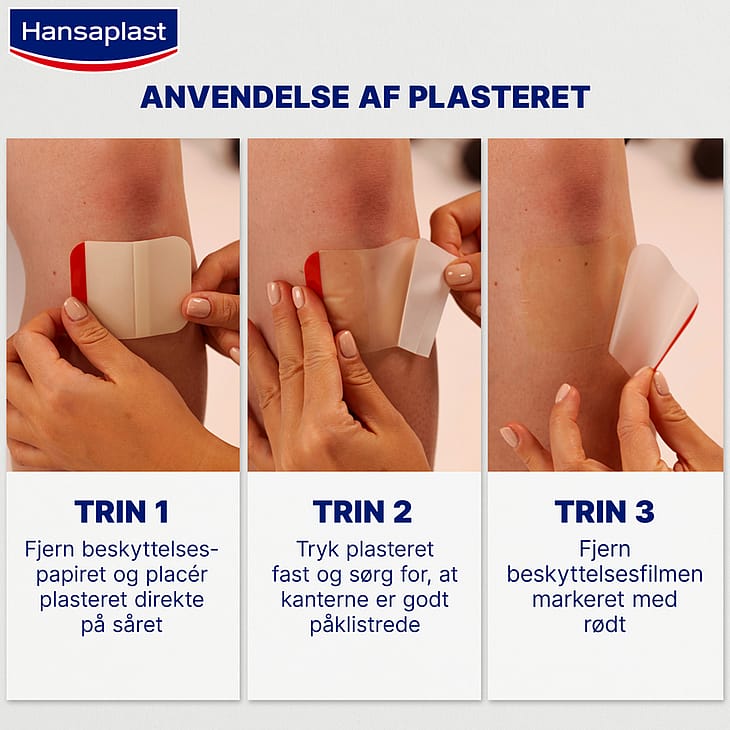 - Trin 2: Påfør plasteret over sårområdet, når huden er helt tør. Sørg for ikke at strække plasteret, når du sætter det på. Brug gribefilmen på bagsiden af plasteret, og undgå at røre ved den klæbende overflade med fingrene.