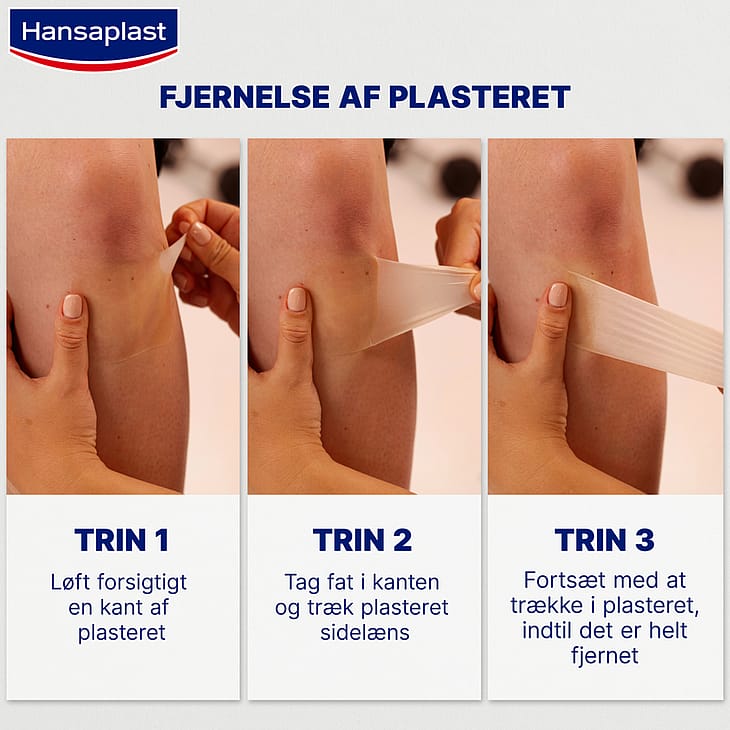 - Trin 3: Lad plasteret sidde på såret, indtil det begynder at skalle af af sig selv. Når du fjerner det, skal du tage fat i den ene ende af plasteret og strække det langs huden.
