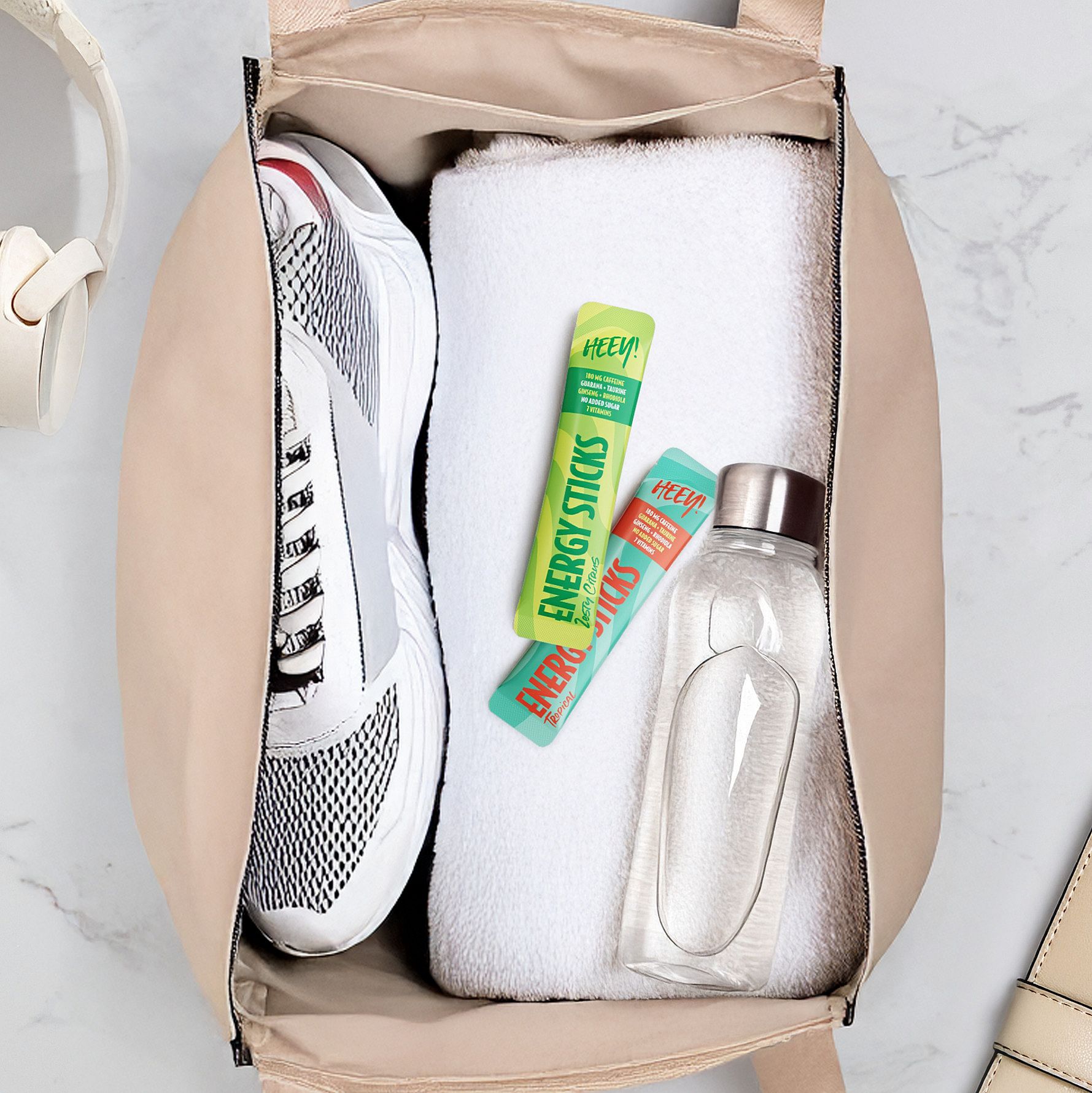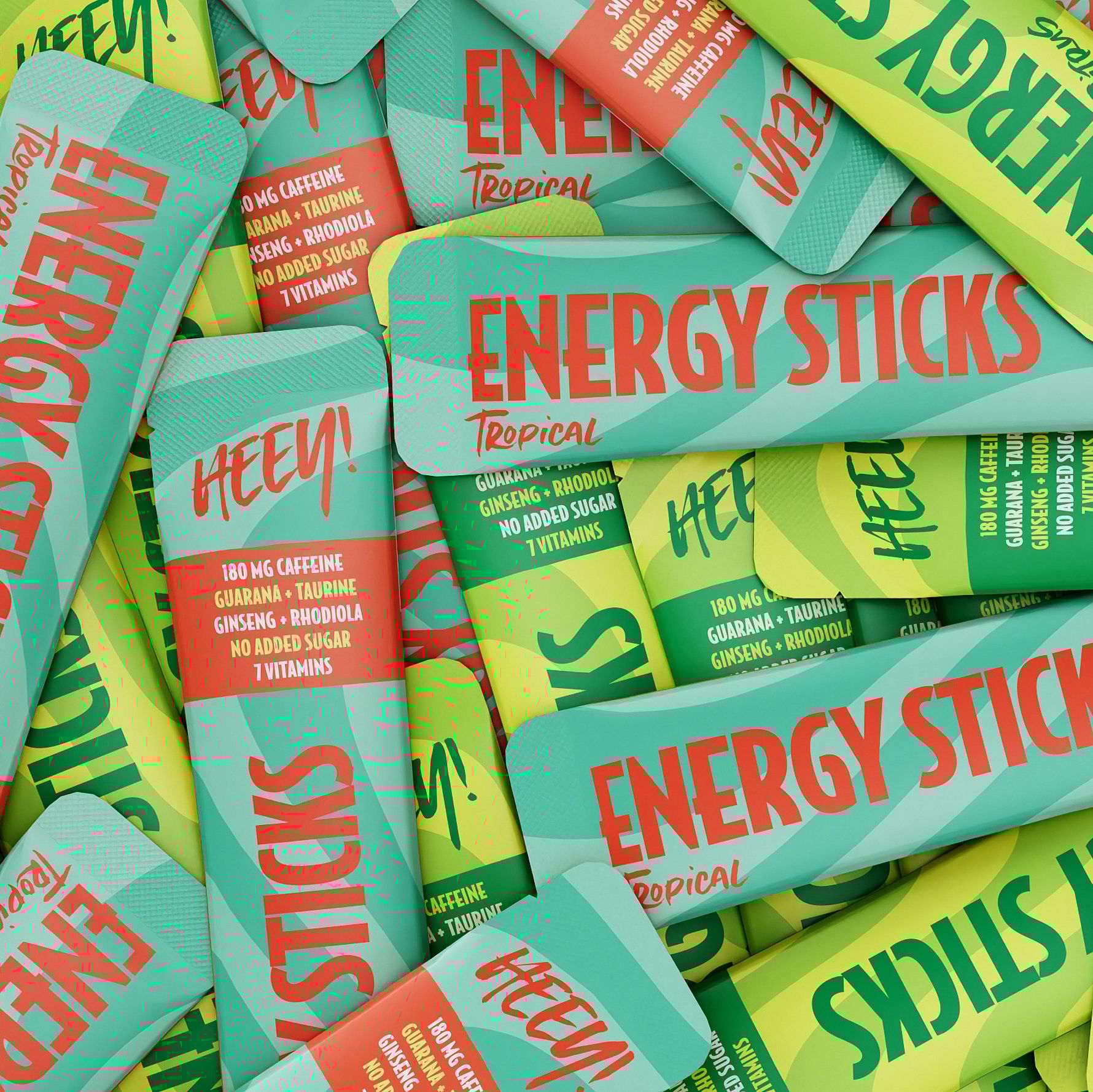 Kosttilskud til voksne. Heey! Energy Sticks. Bland en frisk, sukkerfri drik beriget med vitaminer og planteekstrakter. Alt i en lille stick, der nemt blandes med koldt vand i din drikkedunk eller et glas. Et alternativ til energidrik – uden dåse, uden sukker. Indeholder sødestoffer.