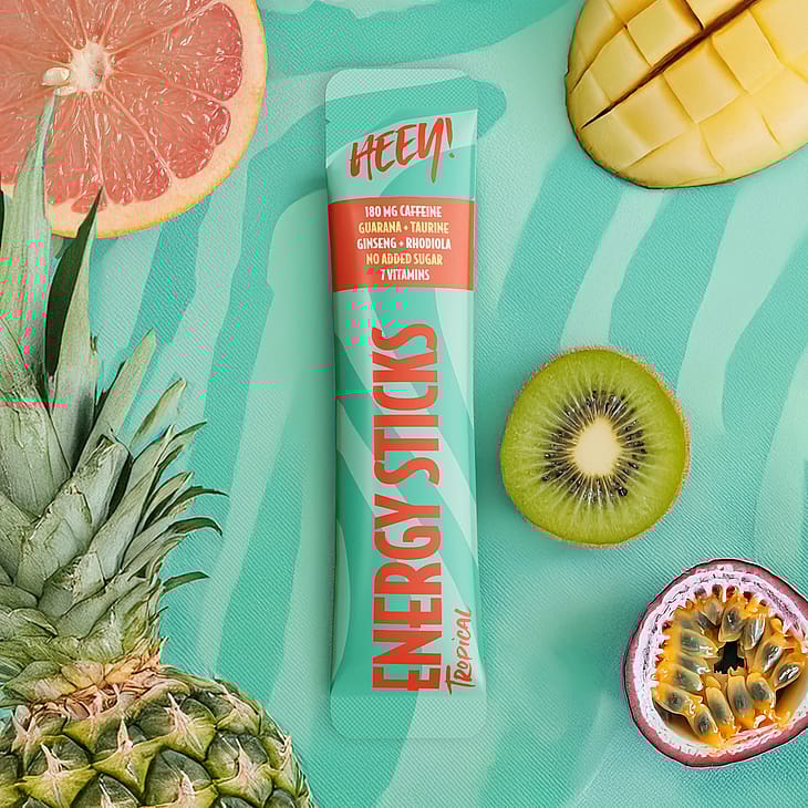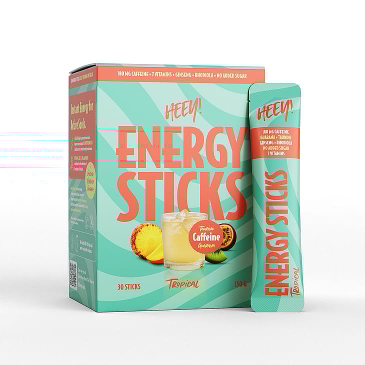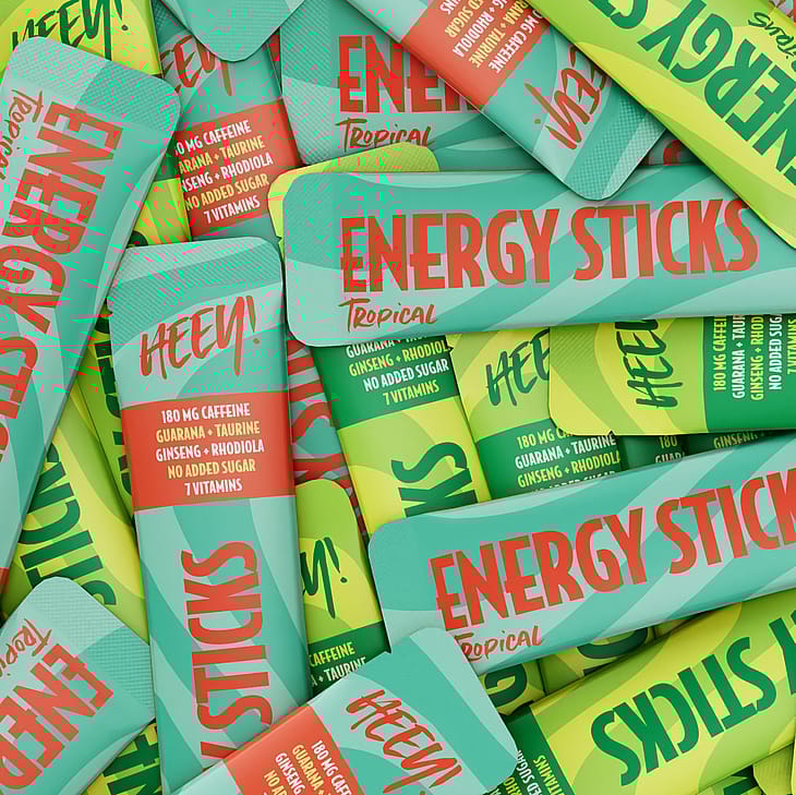 Kosttilskud til voksne. Heey! Energy Sticks. Bland en frisk, sukkerfri drik beriget med vitaminer og planteekstrakter. Alt i en lille stick, der nemt blandes med koldt vand i din drikkedunk eller et glas. Et alternativ til energidrik – uden dåse, uden sukker. Indeholder sødestoffer.
