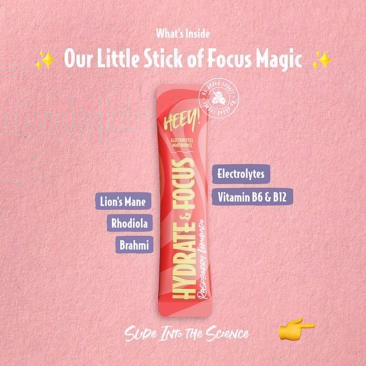 Heey! Hydrate & Focus kombinerer udvalgte elektrolytter og B-vitaminer med plantebaserede ingredienser. Indeholder sødestoffer.