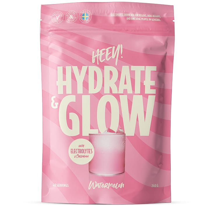 Elektrolytmix Heey! Hydrate & Glow er elektrolyttilskud - kombineret med skønhedstilskud i en Dual Action Formula. Indeholder sødestoffer.