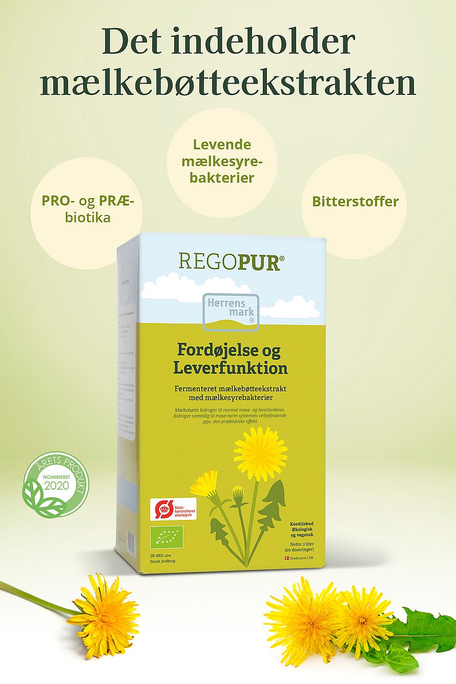 REGOPUR – Fermenteret mælkebøtteekstrakt.Mælkebøtte er en velkendt plante. Mælkebøtte bidrager til normal mave- og leverfunktion, samt mave-tarm systemets velbefindende.
