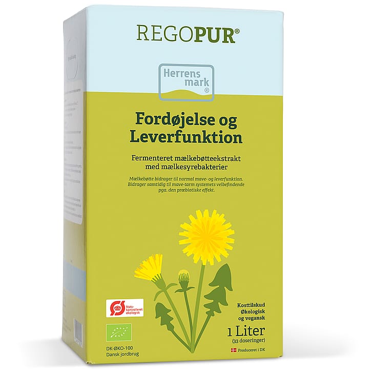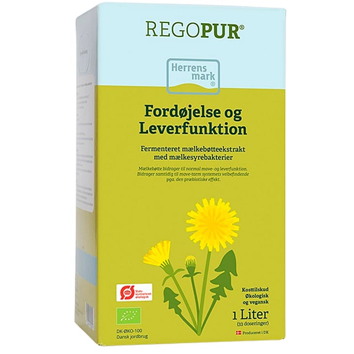 Det fermenterede mælkebøtteekstrakt fra Herrens Mark, REGOPUR er et ikke-pasteuriseret kosttilskud, lavet på pressesaft fra mælkebøtten.