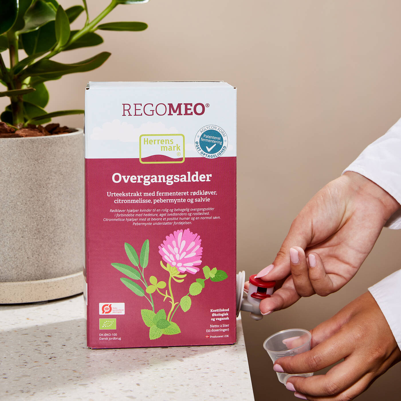 REGOMEO består af økologisk rødkløver som er frisk høstet på markerne på Fyn. Udover den fermenterede rødkløver tilsætter Herrens Mark yderligere fermenteret citronmelisse, salvie og pebermynte. Disse urter er særligt udvalgt i en unik kombination med den fermenteret rødkløverekstrakt, til at afhjælpe gener i forbindelse medovergangsalderen.