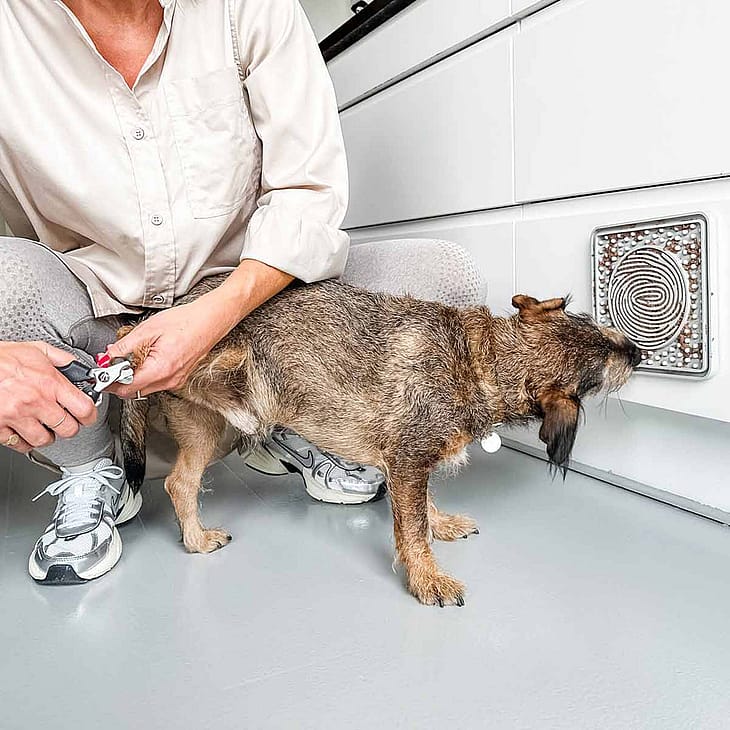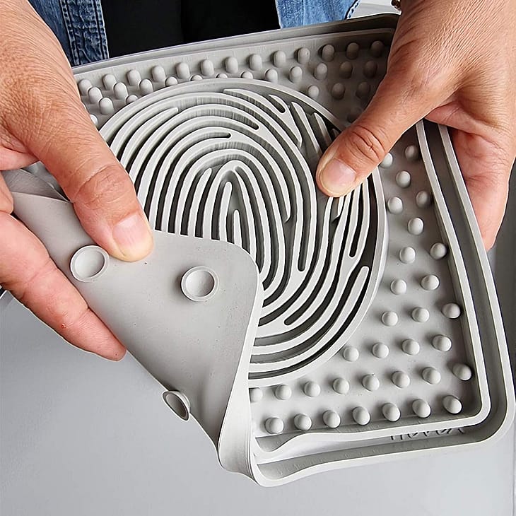 Slikkemåtten har sugekopper bagpå, som gør det muligt at sætte den fast enten på gulvet eller op ad væggen, så din bedste ven kan slikke, mens du for eksempel klipper negle, trimmer, bader osv.