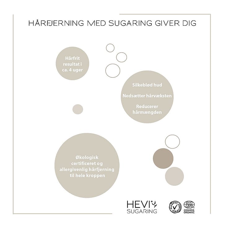 Certificeret af Ecocert og AllergyCertified samt produceret i Danmark. Din garanti for naturlige, allergi- og miljøvenlige HEVI Body Sugaring fjerner skånsomt og effektivt hårene på hele kroppen – også i ansigtet og intimområdet. Giver et glat og hårfrit resultat i ca. 4 uger. Hårfjerningsproduktet er økologisk certificeret og allergivenligt. I modsætning til andre voksprodukter rykkes hårene ud med roden i hårets naturlige groretning, hvilket gør sugaring mindre smertefuld og slutresultatet bedre og flottere med reduceret risiko for knækkede hår og dermed også indgroede hår og røde knopper. Et så skånsomt produkt, at det kan anvendes af alle hudtyper.