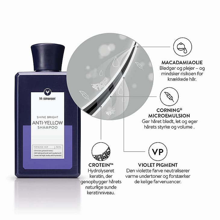 HH Simonsen Anti-Yellow Shampoo er en beskyttende og samtidig plejende shampoo til alle, der har farvet blond eller gråt/isblond hår, men generes af uønskede gule toner i håret.