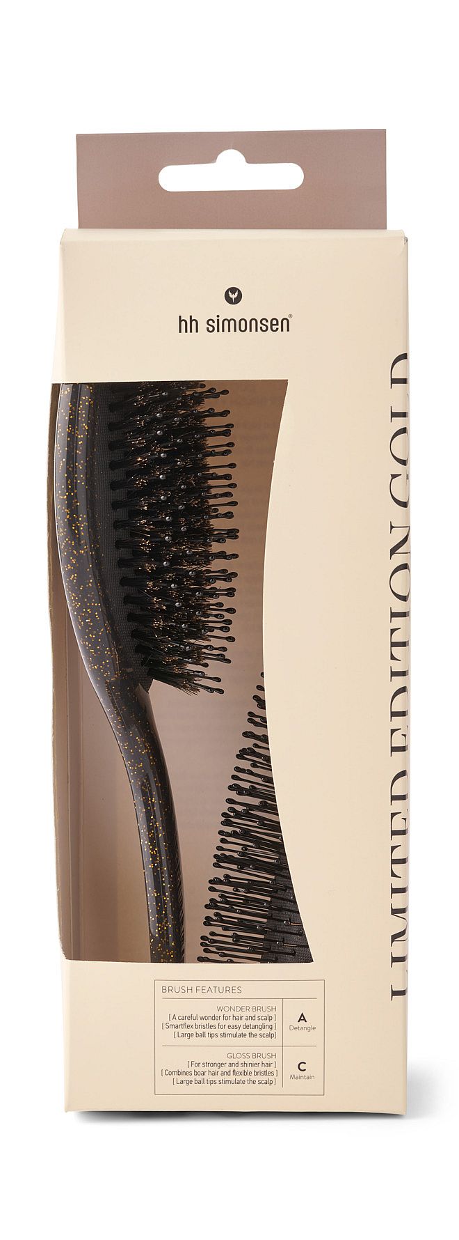 Gloss Brush (Glimmer)Den eksklusive Gloss Brush kombinerer ultrafleksible børstepigge med ægte vildsvinehår, der fordeler det sunde og naturlige hårfedt fra hovedbunden ud i hvert enkelt hårstrås fulde længde. Det giver et både sundere, stærkere og mere glansfuldt hår.