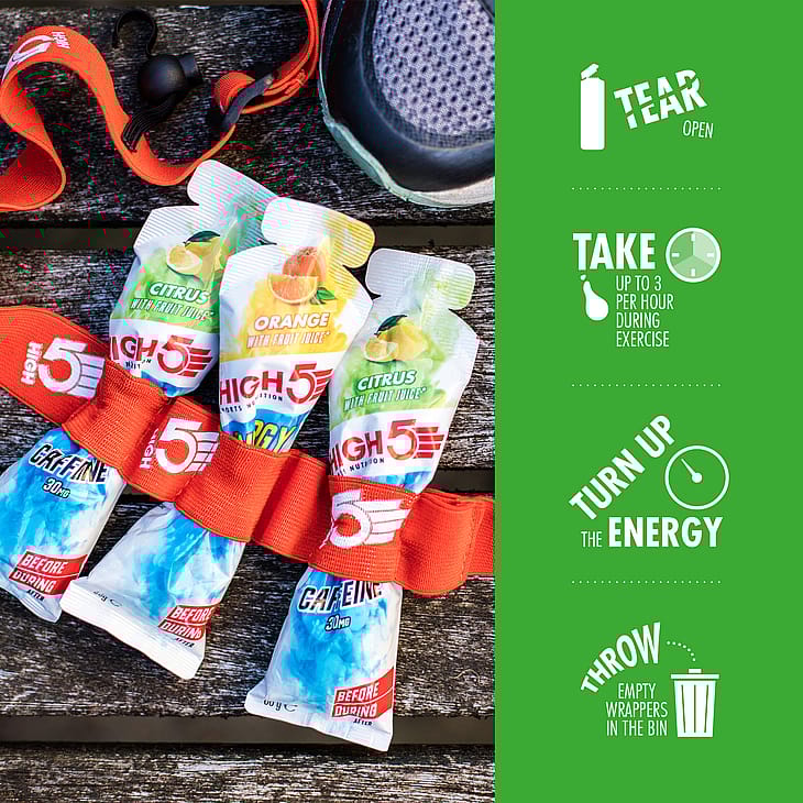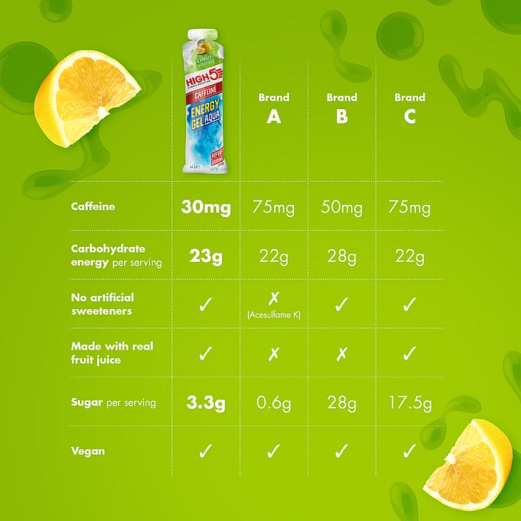 High5 Energy Gel Aqua Caffeine med citrus er lavet på ægte frugtjuice, og har en frisk smag af citron og lime.