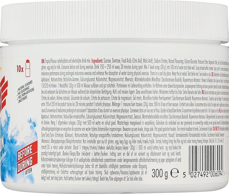 BrugsanvisningBland 1 strøget skefuld (30 g) i 500 ml. vand og ryst grundigt. Ske er inkluderet i bøtten. Indtag før og under træning. Drik 150-250 ml. hvert 20. minut under aktivitet.