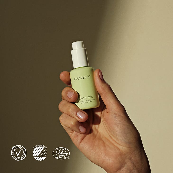 Face Oil er 100% parfumefri og certificeret af AllergyCertified, Cosmos Organic og Svanemærket, hvilket garanterer høje standarder indenfor naturlig og effektiv hudpleje. Velegnet til tør, sensitiv, normal og kombineret hud, kan anvendes under graviditet og amning.