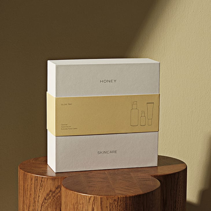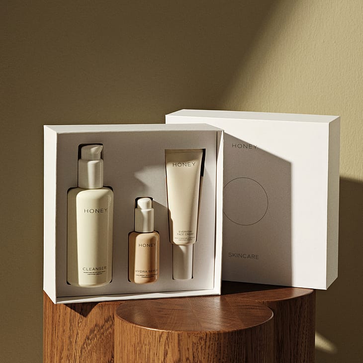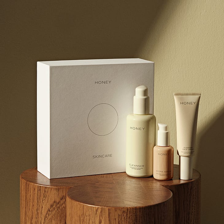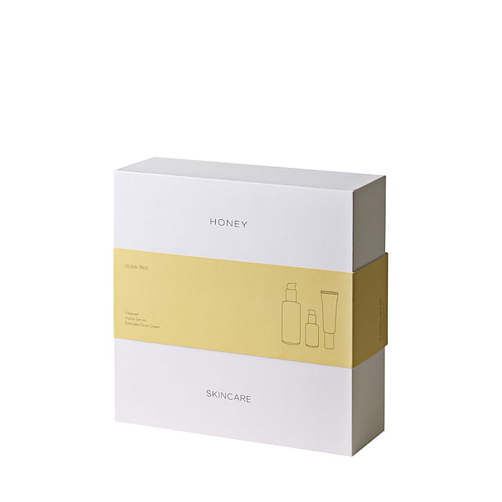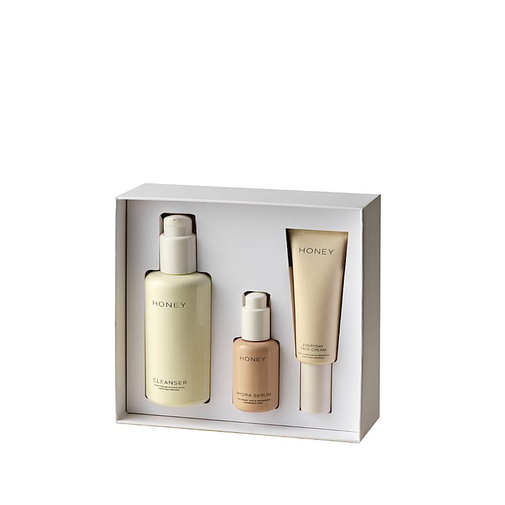 HONEY Glow Trio er et komplet gavesæt fra det danske skincare-brand HONEY, der indeholder Cleanser (120 ml), det prisvindende Hydra Serum (30 ml) og Everyday Face Cream (50 ml). Denne rutine giver intensiv fugt, beroliger rødme og hyperpigmentering og efterlader huden med en naturlig, strålende glød.