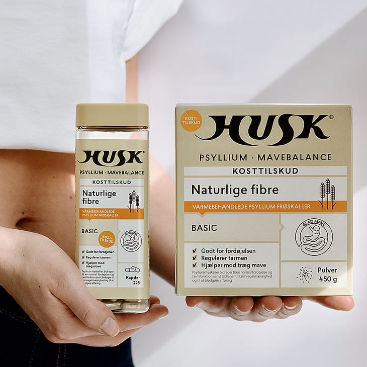 Kosttilskud. HUSK® Psyllium Mavebalance består af pulveriserede og varmebehandlede psyllium frøskaller. Fås også som pulver