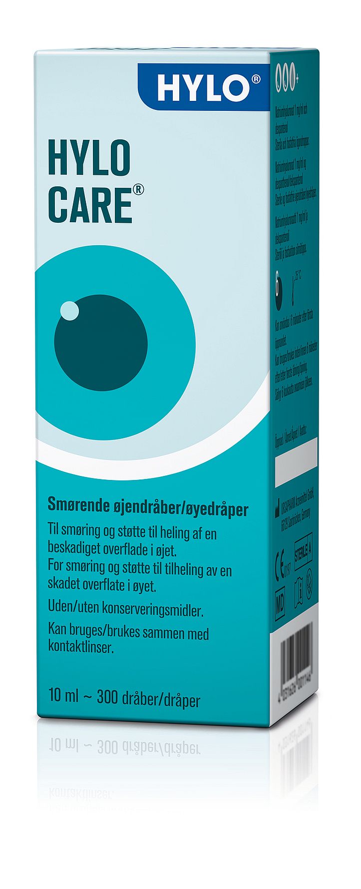 HYLO CARE fugter og hjælper med at hele skader på øjets overflade, f.eks. som følge af tørre øjne eller efter kirurgiske indgreb. Efter kirurgiske indgreb og i tilfælde af tørre øjne er det afgørende, at øjets overflade er tilstrækkeligt fugtet til at muliggøre naturlig sårheling.