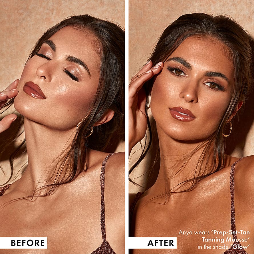 Vores Prep-Set-Tan Mousse er din billet til en naturlig solbrun glød året rundt. Denne revolutionerende tanning mousse er udviklet til at få din krop til at stråle i en lækker, solkysset nuance, der ser naturlig ud, holder længe og er virkelig nem at påføre. Den fås i to nuancer - ORIGINAL for et flatterende, solkysset look og GLOW for den dybeste, mest luksuriøse bronze - og den opfylder alle dine behov for smuk tan OG er tilsat vores karakteristiske glitrende perlemorspigmenter, der giver øjeblikkelig glød, mens din kulør udvikler sig! Uanset om du drømmer om et subtilt strejf af farve eller en fyldig, strandklar kulør, så har vi det, du behøver.