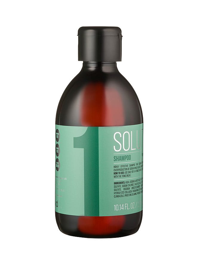 Solutions No. 1 er en shampoo til hovedbunde med fedtet skæl eller overproduktion af talg, hvilket giver fedtet hovedbund. De aktive ingredienser i shampooen, renser mildt hovedbunden, så håret efterlades rent, samtidig med at problemet bliver mindre for hver vask. Shampooen indeholder både climbazole og piroctone olamine, der begge er ingredienser der forhindrer udviklingen af forskellige gærsvampe, som forårsager skæl i hovedbunden. Kan anvendes dagligt eller 3-4 gange om ugen. Denne shampoo skal suppleres med Solutions No. 4. Indeholder hverken parfume eller parabener.