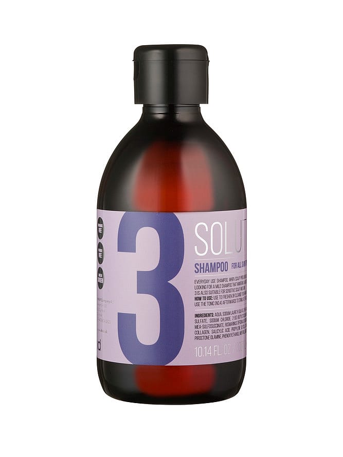 Solutions No. 3 er en shampoo til sensitive hovedbunde, eller til brug efter et eventuelt hovedbundsproblem er løst. Den vedligeholder en sund og afbalanceret hovedbund. Shampooen indeholder undecylensyre, der har en anti-bakteriel virkning, og beroliger irriteret hud, samt forhindrer høj talg afsondring. Derudover indeholder den rosmarin, som bl.a. stimulerer cirkulationen i hovedbunden. Kan anvendes dagligt eller efter behov. Denne shampoo kan evt. suppleres med Solutions No. 4, hvis du ønsker at stimulere mikrocirkulationen. Indeholder hverken parfume eller parabener.