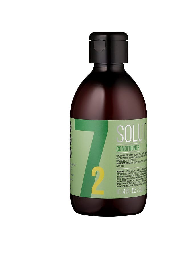 Solutions No. 7-2 er en conditioner til mænd og kvinder der lider af tidligt hårtab. Den plejende conditioner der gør håret både blødt og glansfuld, er også effektiv på hovedbunden. Ligesom shampooen indeholder conditioneren aktive ingredienser, der hjælper med at stimulere hovedbunden, og forhindre udviklingen af gærsvampe der forårsager skæl. Den har også en kølende effekt, takket være indholdet af menthol. Conditioneren skal masseres ind i hovedbunden og gerne virke i 3-15 minutter, så ingredienser får lov at virke. Bør bruges med Solutions No. 7-1 og 7-3 for at opnå det bedste resultat. Indeholder hverken parfume eller parabener.