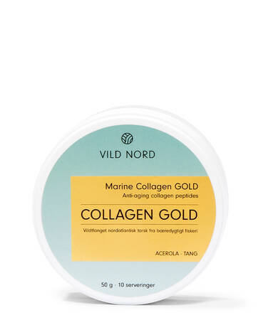 Collagen Gold fra Vild Nord er et fantastisk kosttilskud, som bidrager til at mindske rynker og holde huden spændstig. Produktet indeholder marine kollagen blandet med vitamin C og tang fra havet. Kollagener et protein, der findes helt naturligt i kroppen, og som binder alle kroppens celler sammen – derfor kaldes det også for kroppens lim. Med tiden nedsættesvores naturlige produktion af kollagen, og et kosttilskud kan derfor være en god, hjælpende hånd til huden. Værdi 99,95