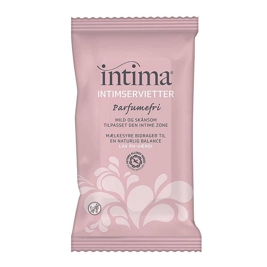 Intima intimservietter er milde, skånsomme og tilpasset den intime zone. De indeholder mælkesyre og har en lav ph-værdi på 4,5. De er fx ideelle at have med i tasken samt anvende på rejse, job og festival og i forbindelse med menstruation og/eller let urininkontinens. Undgå kontakt med øjnene. Deklareret i samarbejde med Astma-Allergi Danmark. Udviklet til den intime zone.