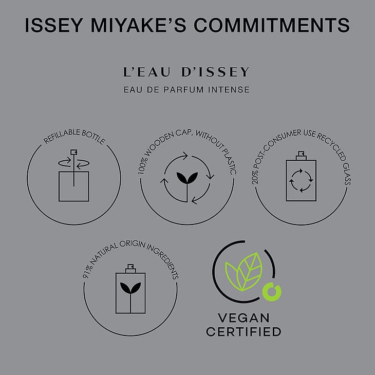 L'Eau d'Issey Eau de Parfum Intense er vegansk, indeholder 91 % ingredienser af naturlig oprindelse og kan genopfyldes.