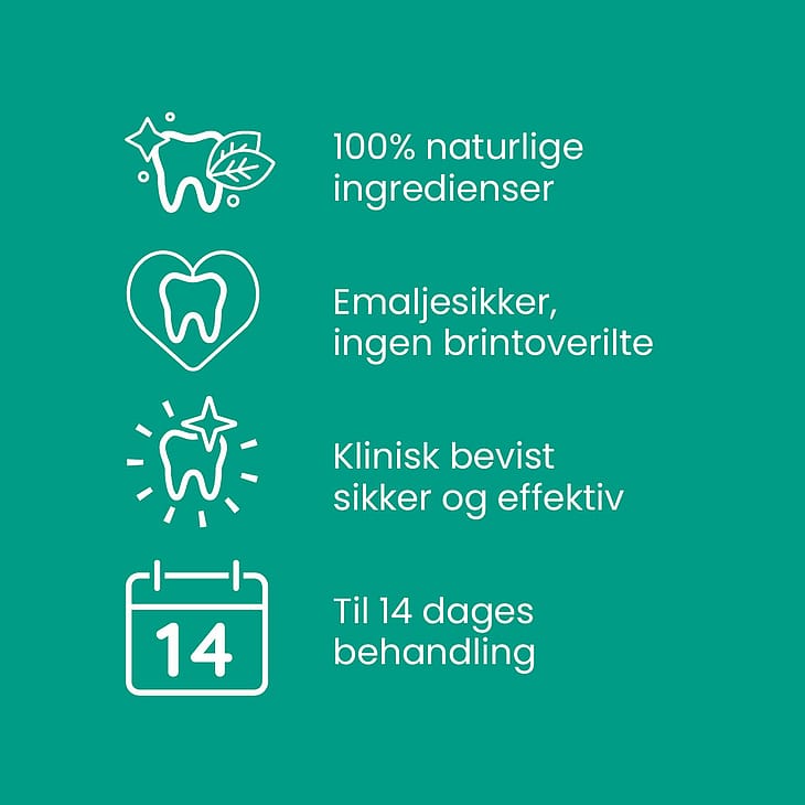 100% SIKKER - Denne blegebehandling indeholder ikke hydrogenperoxid, er 100% sikker for dine tænder og emalje.