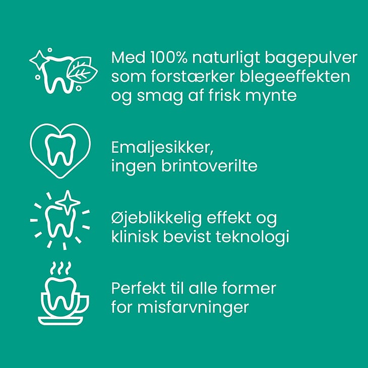 Indeholder en ny, revolutionerende blegegel med 100% naturlig bagepulver for at forstærke blegningsresultaterne og mynteekstrakter for en frisk ånde.