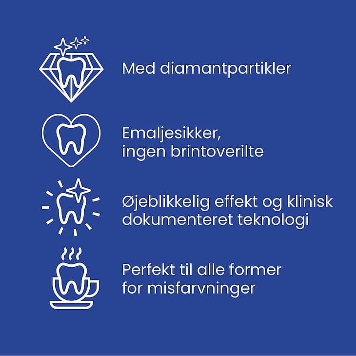 Dette resulterer i et mere intenst hvidt, lyst smil uden at forårsage skade på tænder eller tandkød.