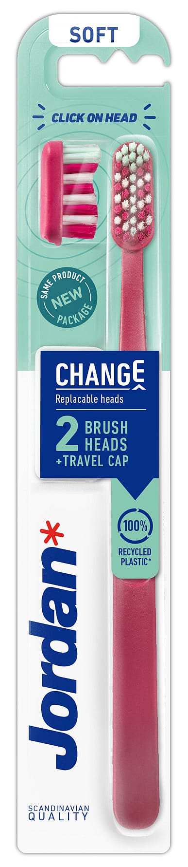 Tandbørsten er lavet af 100% genanvendt plast og leveres med to udskiftelige børstehoveder, som nemt kan klikkes på og af.