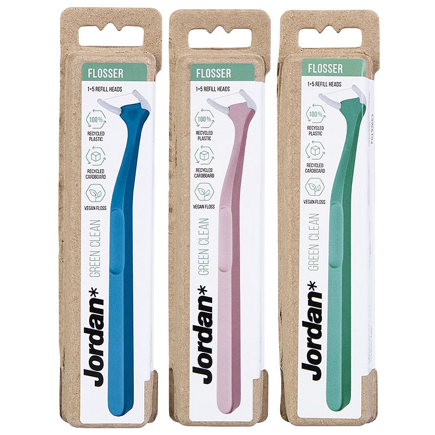 Med det velkendte design fra vores Green Clean tandbørster. Flosser og refills er lavet af 100% genanvendt plastik.
